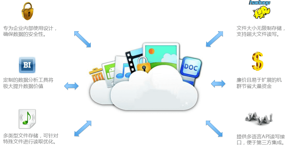 解决爆炸状态的企业数据的安全存储,不易丢失,将文件分散,丧失价值文件统一管理存储进行查询挖掘有效的发挥数据价值